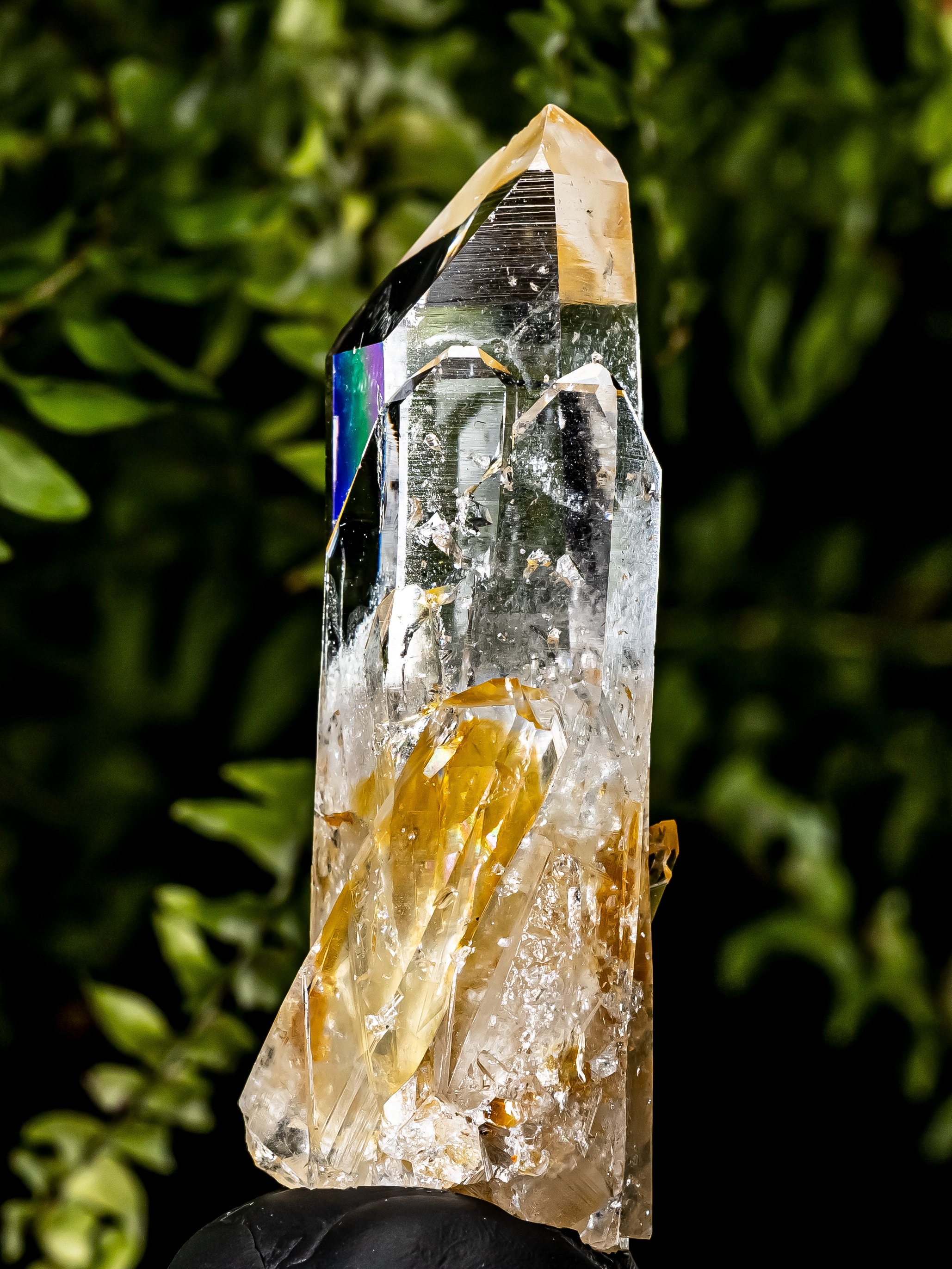 Brilliant internal rainbows appear under light, especially within the lower sections where golden inclusions and micro-fractures interact. These features create flashes of color that shift with movement, enhancing the dynamic character of the specimen.
