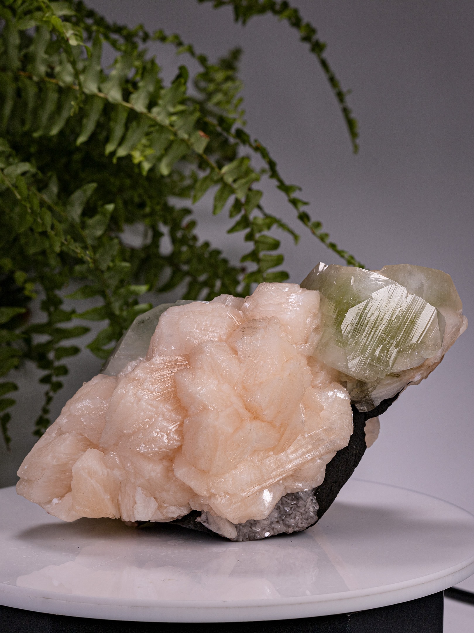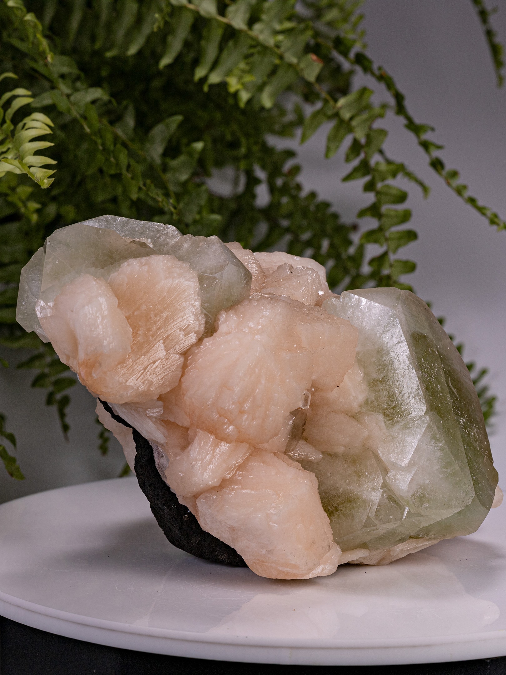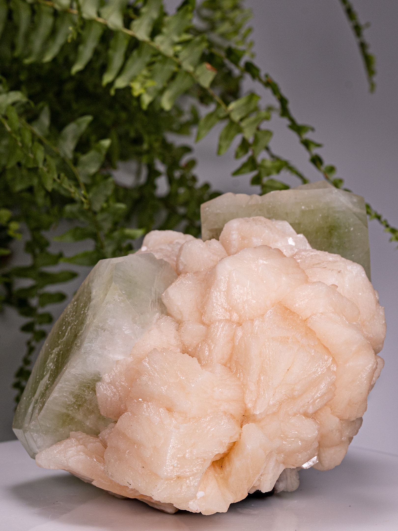 Surrounding the apophyllite, the stilbite forms thick, bladed aggregates that overlap and interlock, creating a rounded, almost floral texture. The peach-pink coloration contrasts gently with the cooler green of the apophyllite and adds visual depth to the cluster.