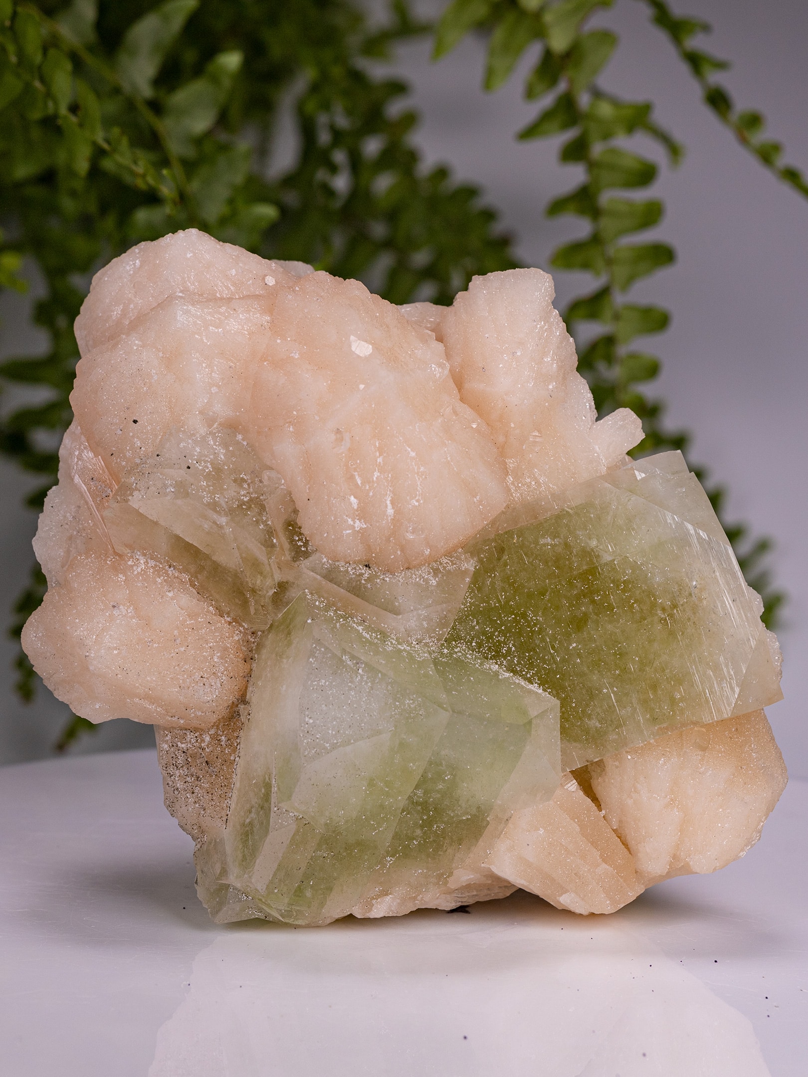 This crystal cluster features sharply defined green apophyllite crystals set among softly layered pink stilbite, creating a visually balanced and naturally sculptural composition.