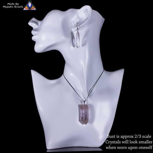 This Natural Vera Cruz Amethyst Pendant and Earring set have beautiful soft lavender color! They are very clear and the luster is great! The pendant has impressive skeletal form! The crystals have been matched for looks and energy compatibility. The bottoms have been cut and polished to receive the fittings – the sides and the terminations of the crystals are in their natural state as they were birthed from the Earth! This pendant comes with an adjustable waxed black cord.