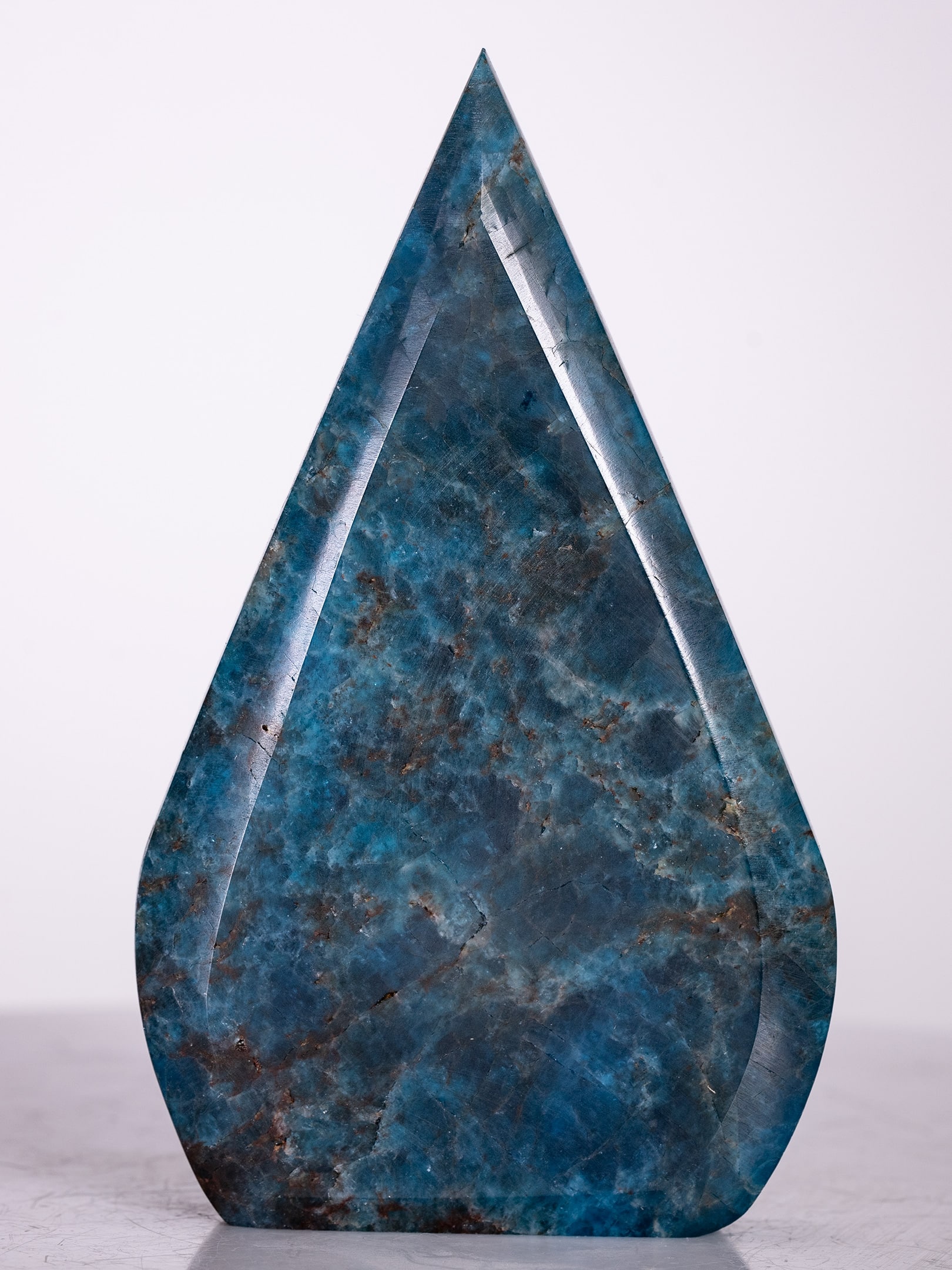 Its flame form rises to a clean point, giving the piece a strong vertical presence while maintaining smooth, flowing contours.